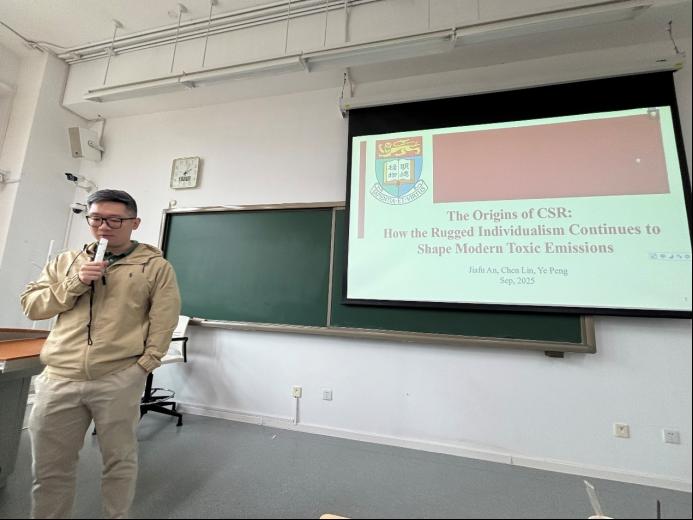 2025年9月23日,保险学院北京市“双一流”共建项目学术讲座暨风险管理与保险论坛(2025年度)第十三讲在沙河校区二教205顺利开展。本次讲座邀请到了香港大学房地产与建筑系助理教授安佳夫博士担任主讲嘉宾,讲座主题为The Origins of Corporate Social Responsibility: How the Rugged Individual Continues to Shape Modern Toxic Emission。讲座由保险学院王吉元副教授主持,吸引了学院多位老师和硕博研究生共同参与和学习交流。