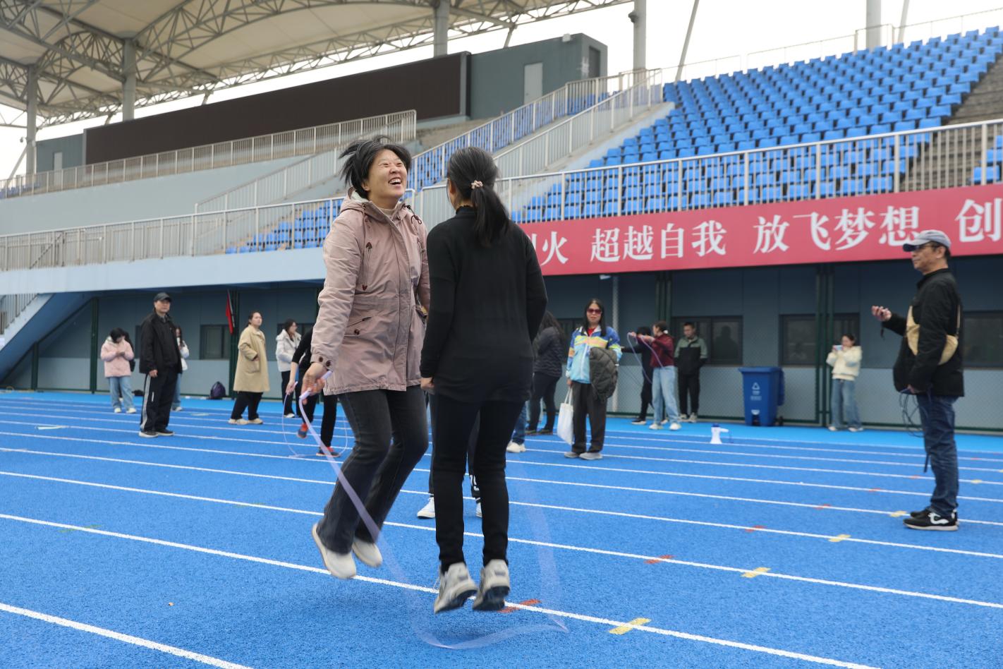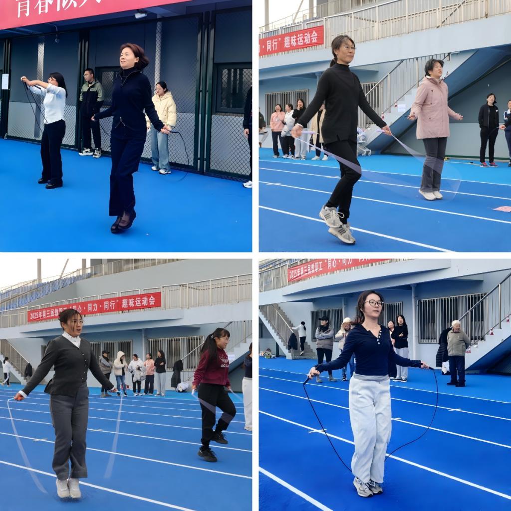 在“单人跳绳赛”的场地上,老师们化身弹跳健将,绳索翻飞,身轻如燕,每一次起落都充满了力量与节奏感,现场计数声、喝彩声此起彼伏,老师们奋勇争先,即使气息渐促仍坚持提速,用坚持与拼搏书写着不服输的劲头。