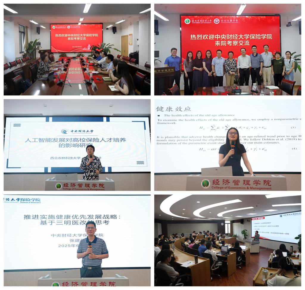 6月9日上午,郑苏晋教授一行四人前往西北农林科技大学经济管理学院开展研究生培养情况调研、学术交流及招生宣讲活动。郑苏晋教授一行与西北农林科技大学经济管理学院就研究生培养情况进行了座谈。双方围绕围绕学科优势、跨学科人才培养、招生就业等核心内容展开深入细致交流。接着,郑苏晋教授以《人工智能对高校保险人才培养的影响研究》为题、刘子宁副教授以《高龄老人补贴和养老机构消费》为题、张建伟副教授以《推进实施健康优先发展战略:基于三明医改的恩考》为题分别作了学术报告。最后,郑苏晋教授面向本科生作了招生宣讲,重点介绍了学院在保险学、精算学、风险管理等领域的学科积淀,包括国家级重点学科建设成果、国际精算师协会认证资质等核心优势,以及产学研融合的培养模式、全覆盖的奖助体系和广阔的就业前景。针对考生关切的报名条件、考试科目、招考流程等问题,团队成员结合历年录取数据进行细致解读,提供个性化备考建议。