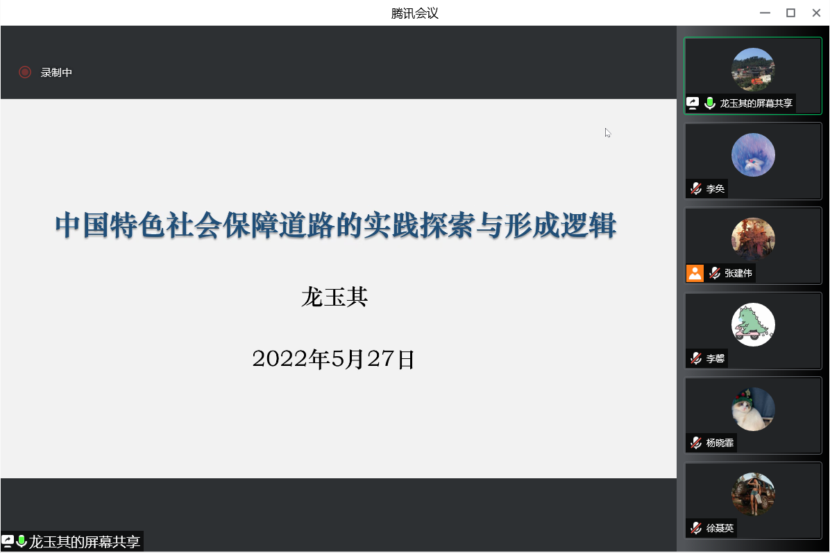2022年5月27日下午,“中国特色社会保障道路的实践探索与形成逻辑”讲座在腾讯会议平台顺利举行。本次讲座邀请到了首都师范大学管理学院副院长龙玉其副教授作为主讲嘉宾,由保险学院劳动与社会保障系系主任张建伟副教授主持。校内外师生40余人参加了讲座。