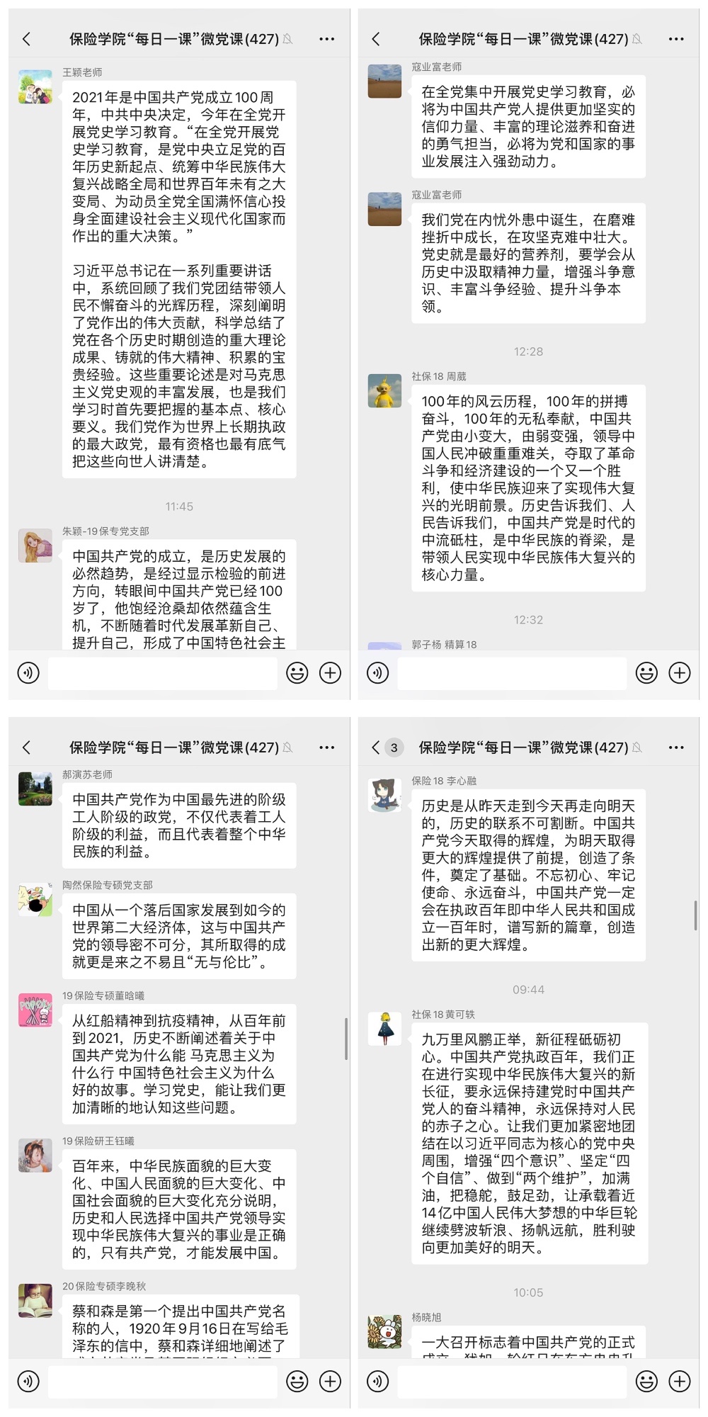 保险学院党委书记王颖老师在“每日一课”微党课平台上宣布“党史天天学”活动正式启动,她指出:在庆祝我们党百年华诞的重大时刻,在“两个一百年”奋斗目标历史交汇的关键节点,在全党集中开展党史学习教育,正当其时,十分必要。今天,距离庆祝建党100周年“七一”大会还有整整100天,在这个特殊的时刻,我们正式启动保险学院“党史天天学”活动,大家要认真学习,积极交流,坚持“学史明理、学史增信、学史崇德、学史力行”,务必取得党史学习教育实效。