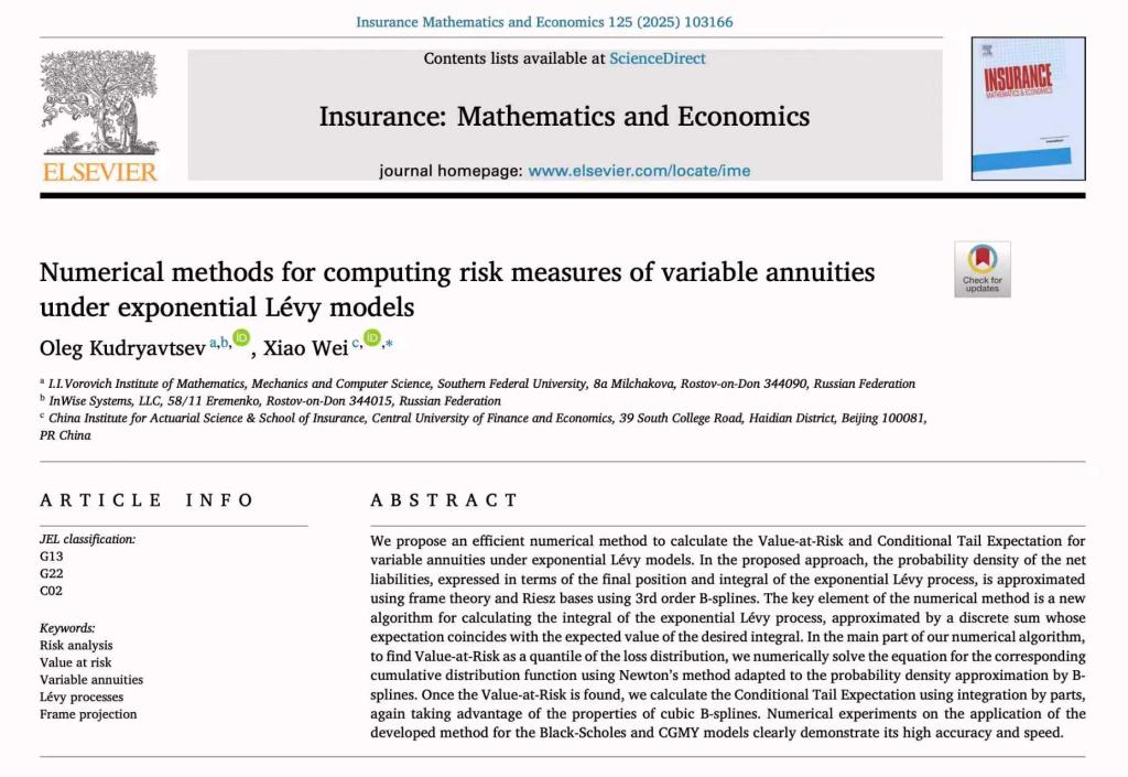 近日,韦晓副教授与合作者俄罗斯南方联邦大学的Oleg Kudryavtsev教授在精算学与金融数学领域国际权威期刊 《Insurance: Mathematics and Economics》 发表题为 “Numerical methods for computing risk measures of variable annuities under exponential Lévy models” 的研究论文。该期刊是风险管理和精算科学领域的旗舰期刊之一,致力于发表保险精算、金融数学及相关领域的高水平研究成果。