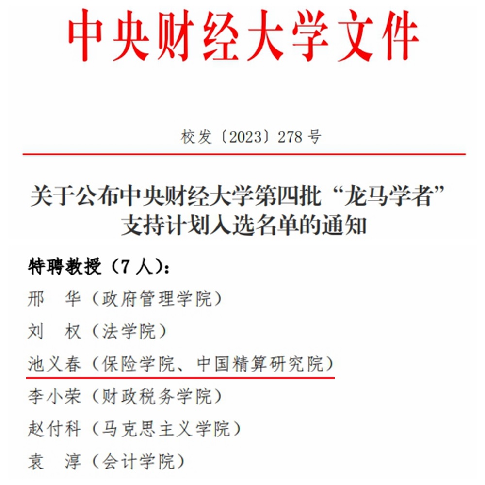 这一年,学院1位教师获评学校第四批“龙马学者”特聘教授,3位教师获评“科教融合研究生学术新星孵化计划”优秀指导教师奖,1位教师获得校涌金教学奖,1位教师获得校鸿基世业优秀学术论文奖。1位教师获得学校教师教学创新大赛一等奖,2位教师获得学校教师教学创新大赛三等奖,1位教师获得学校青年教师教学基本功比赛三等奖。中央财经大学被授予全国首批“精算师职业资格考试中心”。