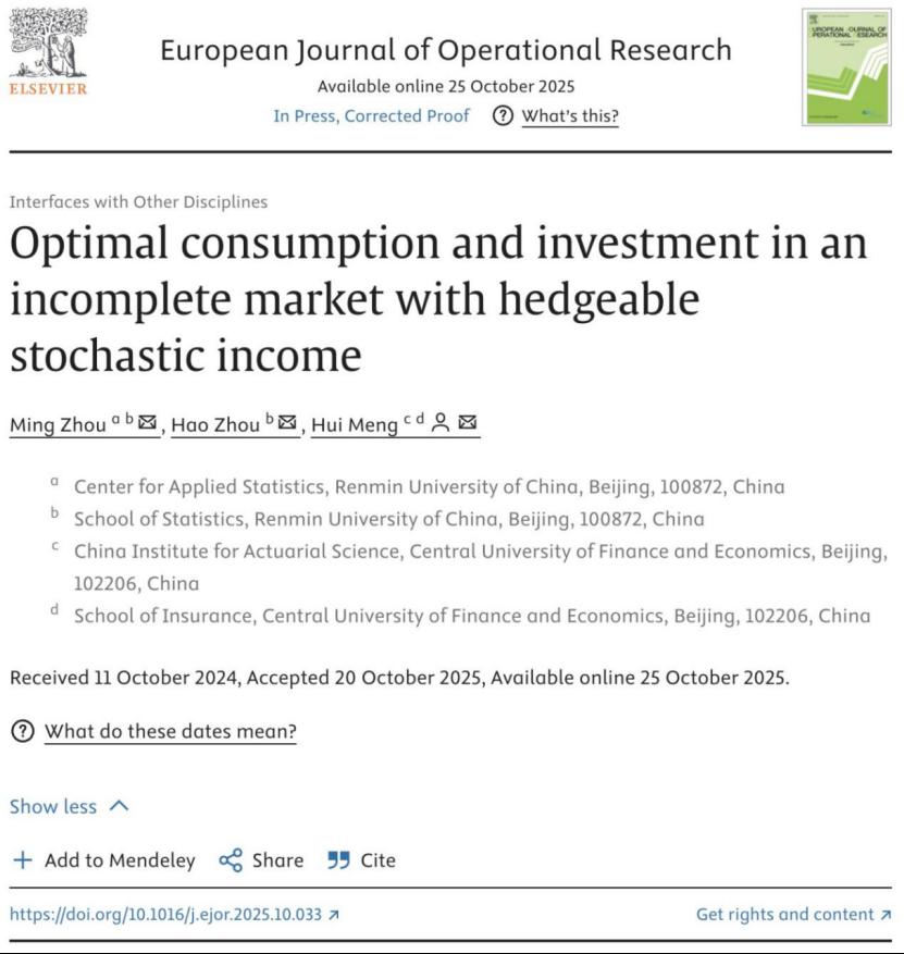 我院孟辉教授近日与中国人民大学周明教授及博士生周豪在我校AAA类期刊European Journal of Operational Research在线发表论文,题目为“Optimal consumption andinvestment in anincompletemarket withhedgeablestochastic income”,其网址为https://www.sciencedirect.com/science/ article/abs/pii/S0377221725008537。