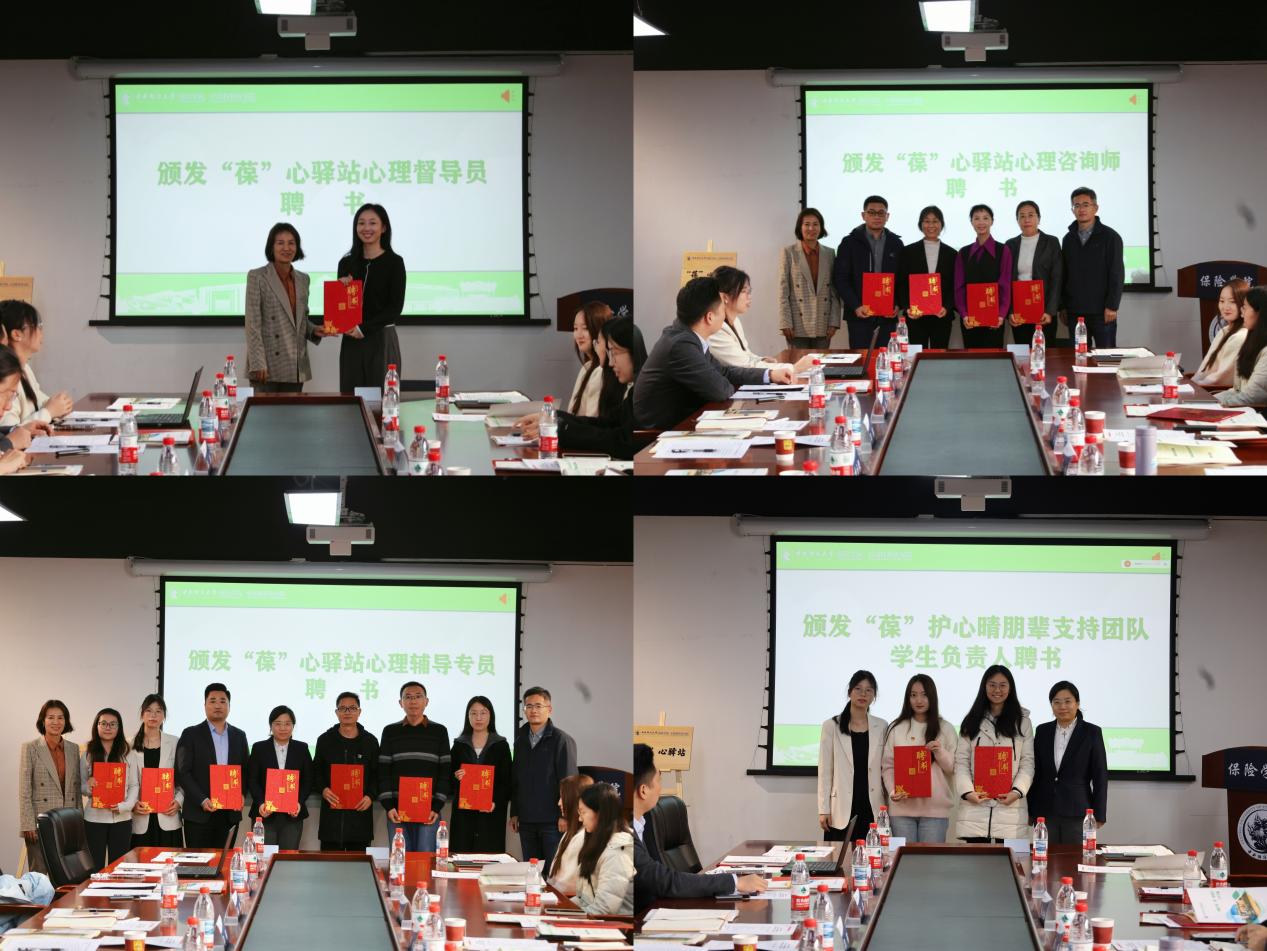 在与会人员的共同见证下,陈振部长、吕丽书记共同为“葆”心驿站揭牌。随后,现场举行了聘书颁发仪式,与会嘉宾分别为“葆”心驿站心理督导员、心理咨询师、心理辅导专员、“葆”护心晴朋辈支持团队指导教师及学生负责人颁发聘书,为驿站的专业化、常态化运行注入坚实力量。