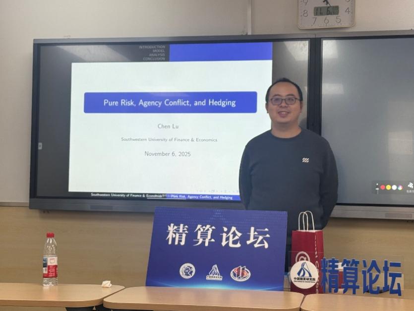 2025年11月6日下午,中国精算研究院第271期精算论坛在中央财经大学沙河校区13号楼301教室举行。本次论坛邀请到西南财经大学金融学院保险与精算系陈路博士,为与会师生带来了题为“Pure risk, Agency conflict, and Hedging”的学术报告。论坛由保险学院、中国精算研究院廖朴副教授主持,博士研究生、硕士研究生积极参与并认真聆听了报告。