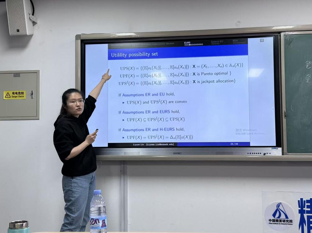 2025年11月7日,我院于沙河校区学院楼13号209教室成功举办第272期精算论坛。本次论坛特邀莫纳什大学经济计量与商业统计系林荔圆博士,为我院师生带来题为《Optimal risk sharing, equilibria, and welfare with empirically realistic risk attitudes》的学术报告。讲座由刘敬真教授主持,我院多位博士、硕士研究生共同参与并聆听了此次报告。