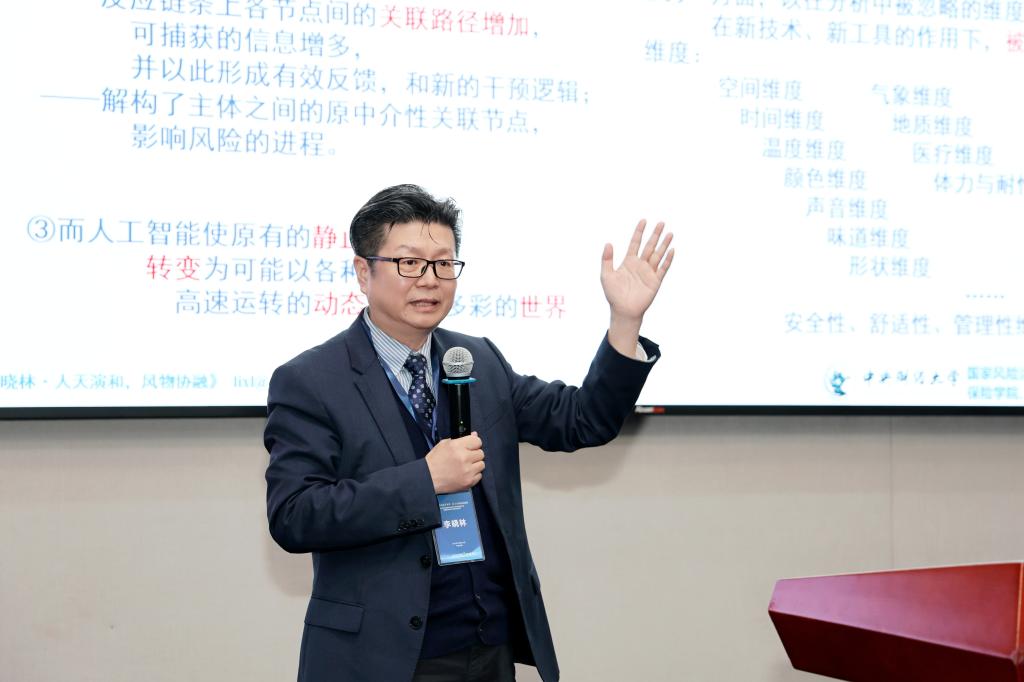 在主旨演讲环节,李晓林教授作了题为《跨界人才的逻辑根基与保险教育的哲学回应》的精彩报告。他从哲学高度审视了保险学科在数智化时代的根本性问题,强调保险教育需超越传统金融框架,构建自主的学科知识体系与底层逻辑,以培养能够应对复杂跨界风险的拔尖创新人才,引发了与会者的深度思考。