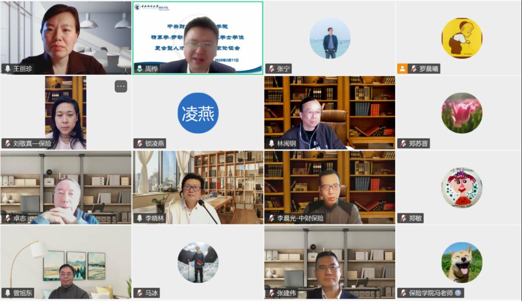 2026年2月11日,中央财经大学保险学院举办劳动与社会保障—精算学双学士学位复合型人才培养项目专家论证会线上会议。参会论证专家包括:教育部高等学校金融类专业教学指导委员会副主任委员,西南财经大学前校长卓志教授;教育部公共管理类专业教学指导委员会委员,南京大学政府管理学院副院长林闽钢教授;全国保险专业学位研究生教育指导委员会委员,北京大学经济学院副院长锁凌燕教授;全国保险专业学位研究生教育指导委员会委员,湖南大学金融与统计学院副院长张宁教授;全国保险专业学位研究生教育指导委员会委员,上海财经大学金融学院保险系主任曾旭东教授;全国保险专业学位研究生教育指导委员会副主任委员,中央财经大学保险学院、中国精算研究院前院长李晓林教授。保险学院院长周桦,副院长王丽珍、郑苏晋和马冰,精算学系系主任刘敬真、副主任郑敏、劳动与社会保障系系主任张建伟、副主任李晨光参加此次会议。