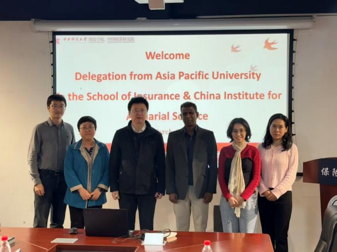 2026年3月12日,亚太科技大学数学、精算与量化研究学院院长Dr. Rajasegeran Ramasamy、精算项目主任Ms. Caryn Chuah一行到访中央财经大学保险学院,双方围绕国际化办学、学生联合培养、交换项目合作等事宜开展专题座谈,就深化两校精算学科领域合作达成广泛共识。中央财经大学保险学院、中国精算研究院院长周桦,副院长郑苏晋、马冰,精算科学系主任刘敬真出席座谈。座谈会由马冰副院长主持。