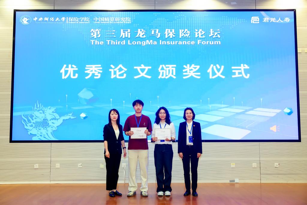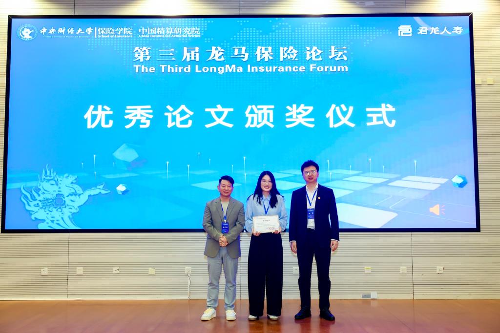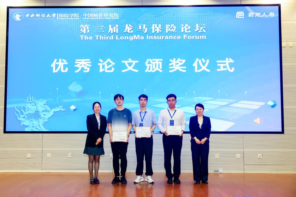 论坛最后举行了优秀论文颁奖仪式,由保险学院、中国精算研究院副院长马冰副教授主持。周桦院长与君龙人寿总经理助理、财务负责人、董事会秘书处范启泓,吕丽书记与君龙人寿人力资源部、培训部总监吴美美,王丽珍副院长与君龙人寿精算临时负责人张瑶玫分别为一、二、三等奖获得者颁发荣誉证书。获奖作者纷纷发表感言,论坛在热烈氛围中圆满落幕。