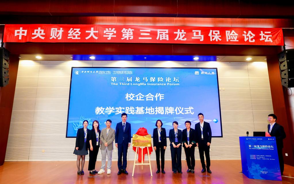 致辞环节后,举行中央财经大学—君龙人寿校企合作教学实践基地揭牌仪式。君龙人寿总经理廖明宏与保险学院党委书记吕丽共同为基地揭牌,标志着双方产教协同、人才培养合作进入新阶段。