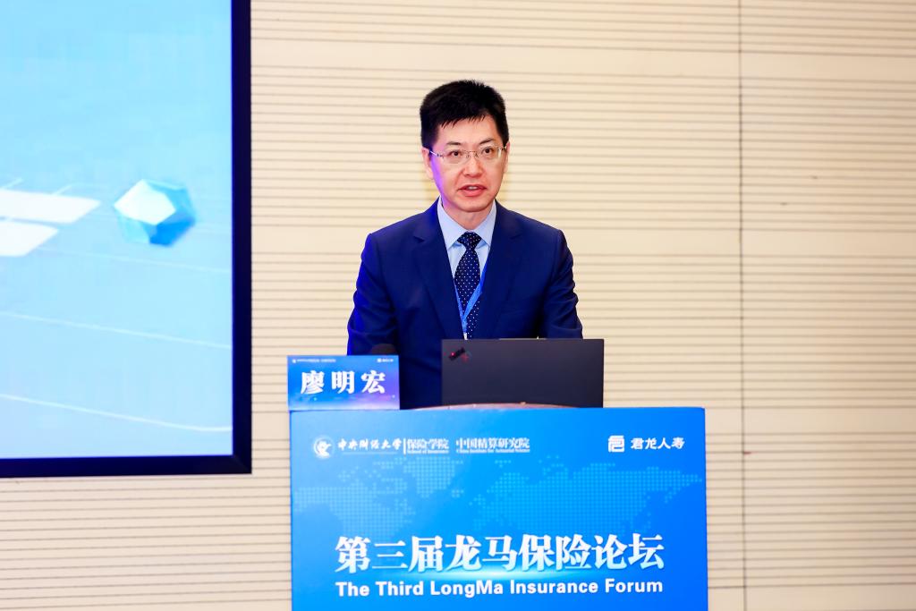 廖明宏代表君龙人寿对论坛召开表示祝贺。他表示,中财保险学科积淀深厚,为行业发展提供了坚实理论与人才支撑,龙马保险论坛已成为保险领域学术交流与实践对话的重要平台。他分享了君龙人寿坚持差异化发展,聚焦“一老一少”及细分病种市场,持续推进产品创新与服务升级等方面取得的成效。公司将以“产品+服务、渠道、投资”为战略支柱,强化数字化建设,不断提升风险管控与服务能力。他期待未来与中财在产教融合、实习实践、人才共育等方面深化合作,携手推动保险学科建设与行业高质量发展。