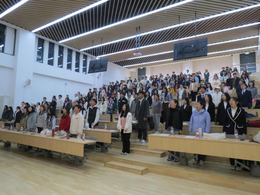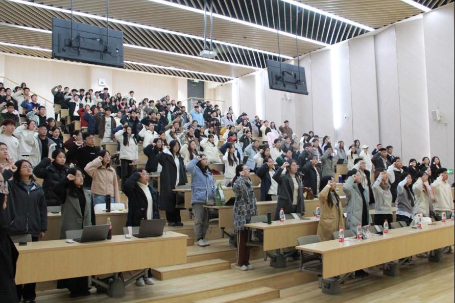 活动伊始,全体成员起立。随着激昂的《义勇军进行曲》奏响,全场肃立,行注目礼。高昂的歌声在教室回荡,不仅点燃了每一位学员心中的爱国之情,更凝聚了大家作为共青团员的责任感与使命感,为本次基础团校学习注入了初心力量。