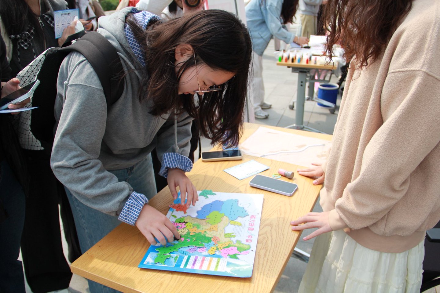传统安全守护站以家国为魂,以文化为脉。在中国地图拼图挑战中,同学们聚精会神、巧手拼接,于方寸之间感受山河壮阔,在指尖悄然厚植国土安全意识。非遗漆扇制作区则透着雅致与隽永,大家以扇面为纸、笔墨传情,在手作中触摸文化根脉,守护文化安全,也让文化自信与安全理念悄然相融。