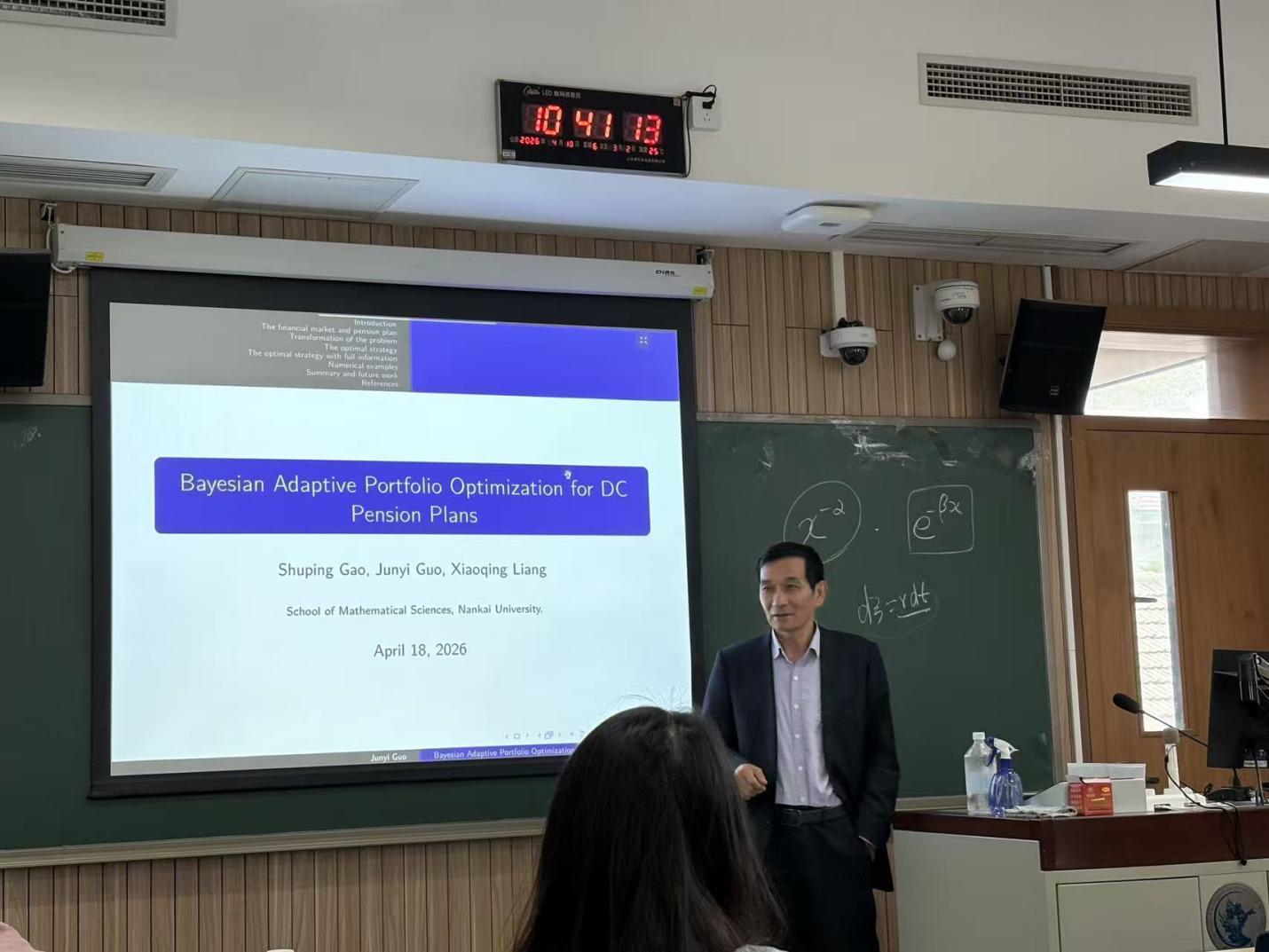 郭军义教授作了题为“Bayesian Adaptive Portfolio Optimization for DC Pension Plans”的学术报告。郭老师围绕部分信息下缴费确定型(DC)养老金基金的最优投资问题展开分析,介绍了如何在包含无风险资产、股票和通货膨胀指数债券的金融市场中,利用贝叶斯方法与滤波理论,将原始的不可观测优化问题转化为完全信息下的优化问题,并进一步借助辅助过程和鞅方法求解含最低消费约束下的最优投资策略。最后,他还比较了在完全可观测市场和常数相对风险厌恶效用框架下的最优投资策略。报告内容兼具严谨的理论推导与鲜明的应用背景,展示了随机过程、金融数学与精算科学交叉研究的前沿进展。