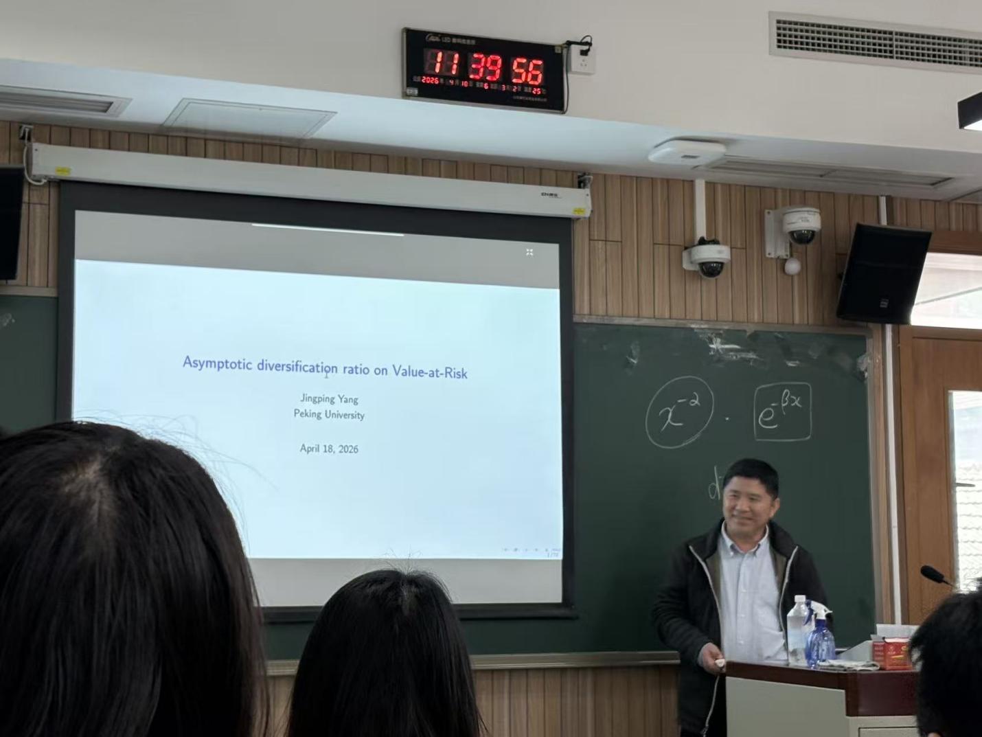 杨静平教授的报告题目为“Asymptotic Diversification Ratio on Value-at-Risk”。杨老师结合团队近期研究成果,围绕投资组合风险价值(Value-at-Risk)的渐近分散化比率展开深入阐述。他分别从多风险情形下VaR的渐近次可加性与超可加性,以及一般聚合风险函数框架下广义分散化比率两个方面,分析了边缘分布不确定性与风险相依结构对风险度量的影响,并给出了具有尾部相依的copula结构下相关指标的界限结果。报告还结合金融数据、风险资本和机动车保险等案例进行了实证分析,充分展示了相关理论在金融保险领域中的应用价值。