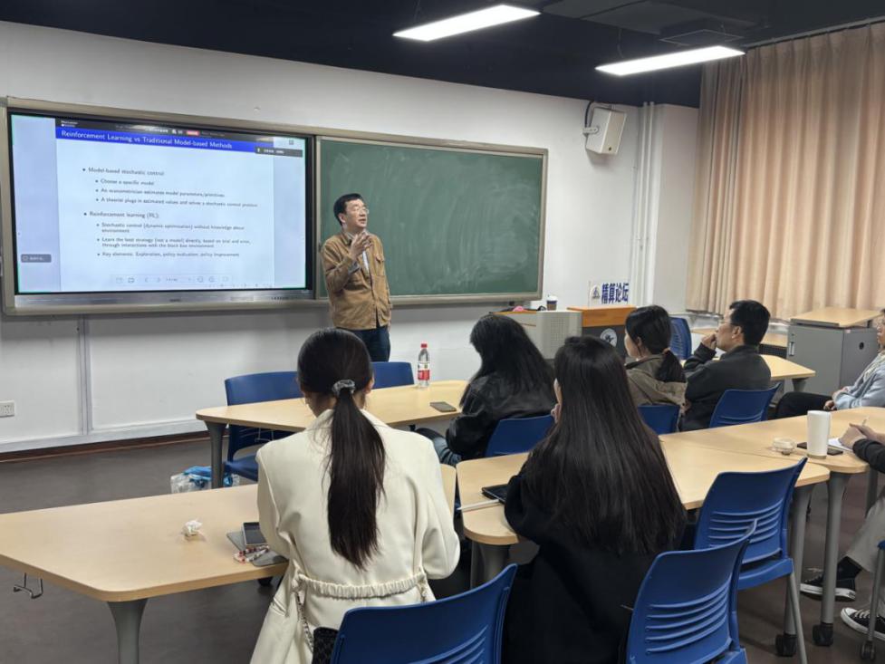 2026年4月16日下午,中央财经大学中国精算研究院在沙河校区学院楼13号楼209教室顺利举办第283期精算论坛。本期论坛特邀香港理工大学戴民教授和南开大学南开-泰康保险与精算研究院赵慧教授,分别以“基于随机化Dynkin博弈的带有交易成本的最优投资策略学习”“模型不确定性下带有定期绩效评估的投资组合选择问题”为题,带来精彩的报告。本次论坛由刘敬真老师主持,吸引了众多师生踊跃参与,展现了金融数学、随机控制与强化学习交叉研究的前沿活力。