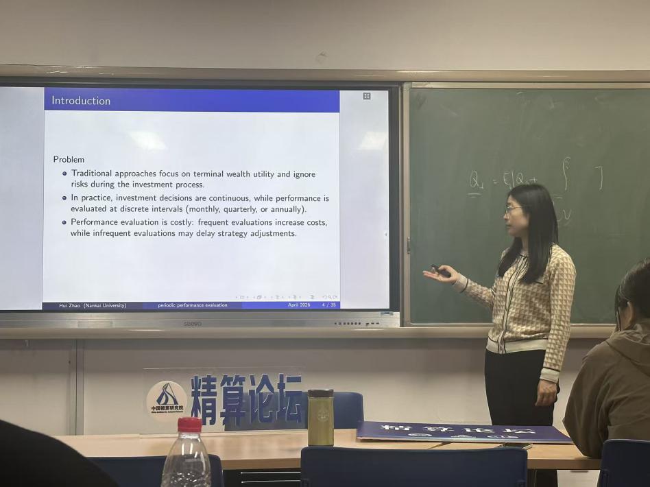 第二场报告中,赵慧教授聚焦于基金管理中的核心矛盾,提出了一种新的投资组合选择模型,同时引入模型不确定性与定期绩效评估。在该模型中,基金经理连续制定投资策略,但其绩效在若干离散时间点被评估,评估的标准为当前财富与某一基准的比值。此外,模型还引入评估成本函数,用于在确定评估周期时权衡成本与收益。通过动态规划原理,赵教授将原始问题转化为一个辅助的单期优化问题,并据此求得最优投资策略与对应的值函数,数值模拟结果表明:评估成本越高,最优评估周期越长,值函数越低。这一研究为基金公司设计更科学、更具激励相容性的绩效考核制度提供了理论支撑。