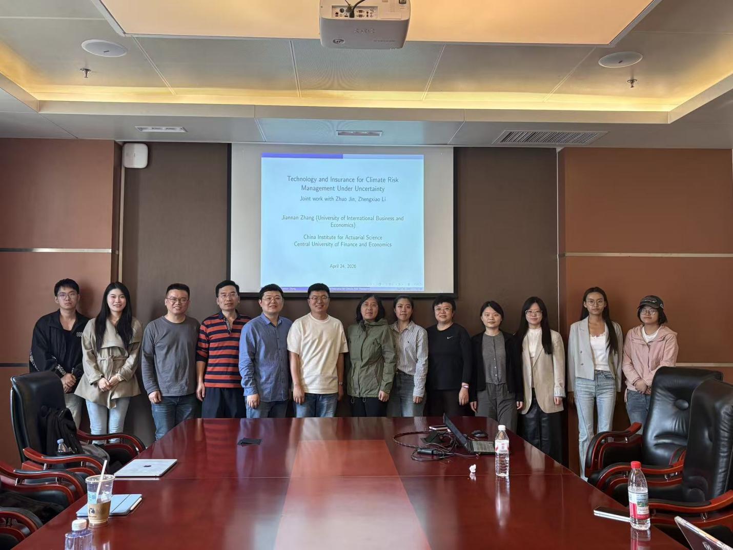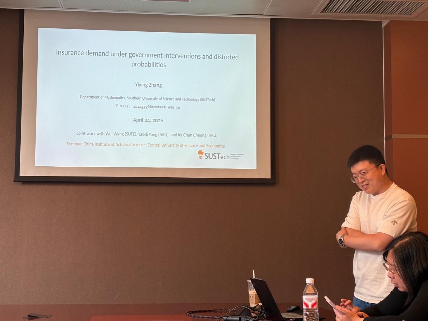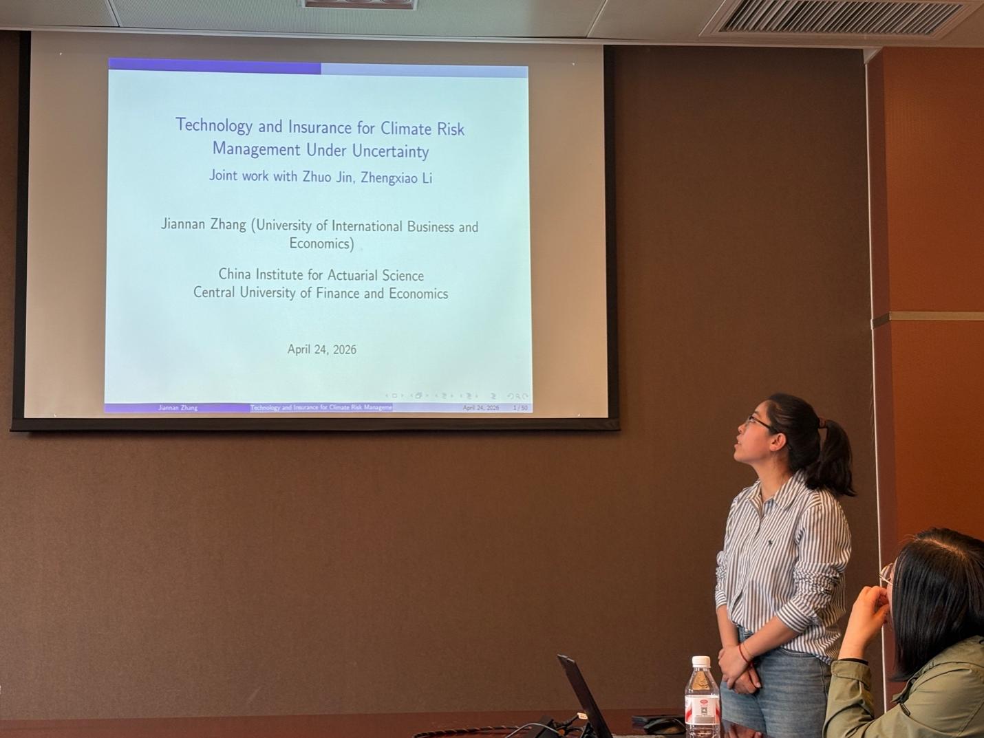 2026年4月24日上午,中国精算研究院第284期精算论坛在中央财经大学学院南路校区学术会堂602举行。本次讲座邀请到中国矿业大学数学学院田德建副教授、南方科技大学数学系张艺赢副研究员、对外经济贸易大学保险学院张建楠老师作专题报告。讲座由中国精算研究院池义春教授主持,包含北京邮电大学等多所在京高校的师生参与了论坛。