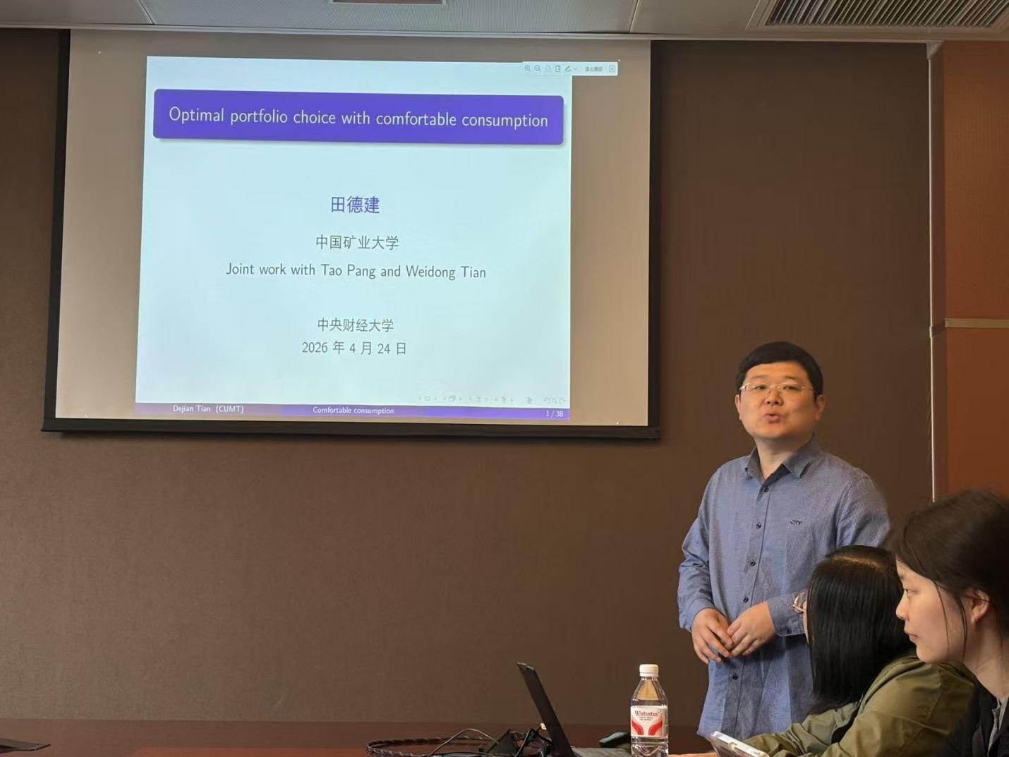 田德建老师以“Optimal portfolio choice with comfortable consumption”为题,与大家分享近期完成的工作。报告围绕带有最低舒适消费约束的Merton型投资组合优化问题展开,采用随机控制方法,通过一种新颖思路将HJB方程转化为二阶常微分方程,从而精确刻画候选价值函数集合,并在此基础上显式求得最优消费率、投资策略和价值函数。田老师指出,该方法还可进一步推广至其他带约束的投资组合选择问题,并可用于研究考虑通货膨胀情形下的模型。最后,他结合退休基金、养老金、捐赠基金以及经济增长中的AK模型等应用场景,展示了相关研究在金融优化中的重要理论与应用价值。
